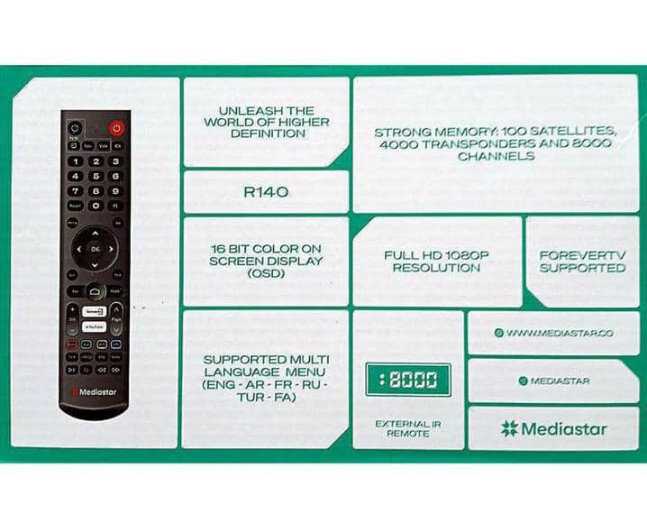14- دارای یک عدد ریموت کنترل بزرگ و همچنین ساپورت تمامی ریموت کنترل های مدیا استار